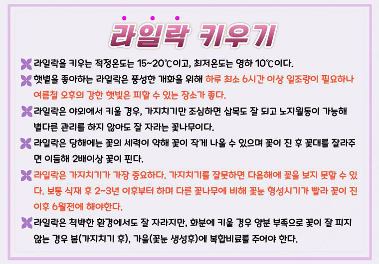 | 상품설명 | 특징 - 일반 라일락보다 키가 크지 않고 꽃이 많이 피며, 달콤한 향기가 진하고, 풍성한 꽃을 자랑한다. - 5월부터 10월까지(여름~가을) 긴 기간동안 꽃을 볼 수 있으며, 봄철 한차례 꽃이 핀 후 여름에 다시 개화를 시작하여 가을까지 계속적으로 핀다. - 1년에 2번 개화하는 사계라일락으로 진한 분홍색의 꽃이 피며, 풍성한 꽃을 자랑한다. - 화려한 꽃과 풍성한 수형으로 포인트식재, 정원수, 관상수로 적합하다. |