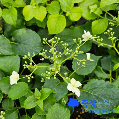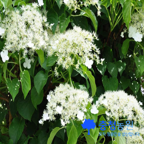 2. 녹색의 광택이 나는 싱그러운 잎과 레이스 같은 흰꽃이 아름다운 덩굴로 자라는 수국이다.